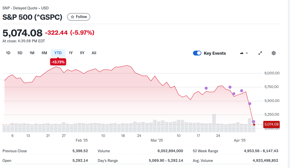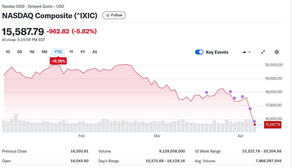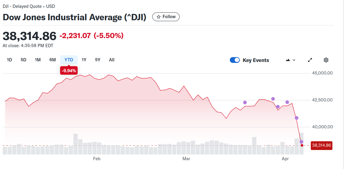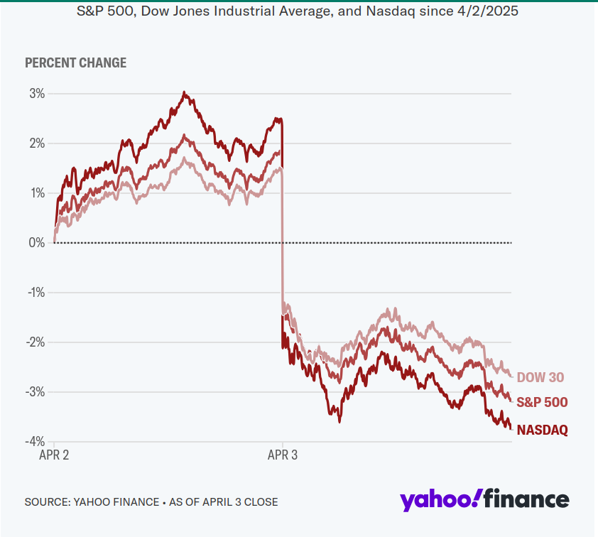 In just forty-eight hours (as I write this on 4 April 2025) the stock market has gone off a cliff. The Dow Jones Industrial Average fell 2231 points, Nasdaq fell 962 points, and the S&P 500 fell 31 points. Trump, of course, says the stock markets are now booming... and if he happened to mean "boom" as in "detonation" he's not lying for once.